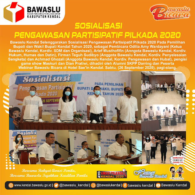 Acara bertajuk Sosialisasi Pengawasan Partisipatif Pilkada 2020 oleh Bawaslu Kendal ini dihadiri alumni Sekolah Kader Pengawas Partisipatif (SKPP) Daring, Sahabat Bawaslu Kendal yang aktif mengikuti webinar Bawaslu Bicara dan mahasiswa. “Kami mengundang alumni SKPP Daring, Sahabat Bawaslu yang aktif mengikuti program Bawaslu Bicara dan mahasiswa yang sebagian besar anak muda Kabupaten Kendal,” kata Arief Musthofifin Kordiv Hukum Bawaslu Kendal.