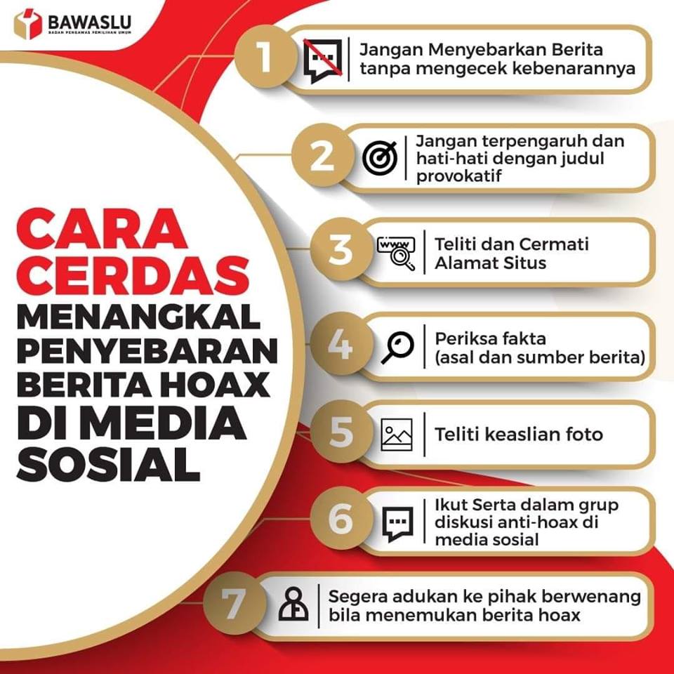 Selamat pagi Sahabat Bawaslu semangat menjalankan aktivitas hari ini. Mari menjadi masyarakat yang cerdas dalam menangkal penyebaran berita hoax di sosial media 😎😎