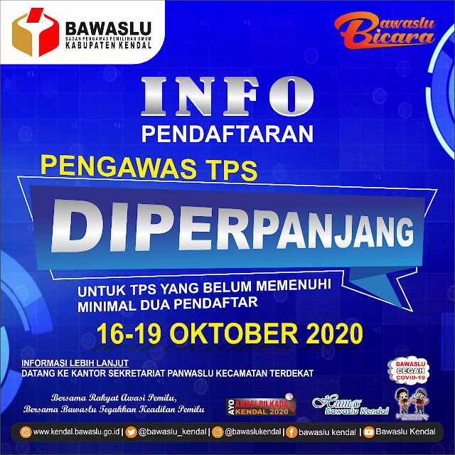 Mulanya masa pendaftaran Pengawas TPS di Kendal tanggal 3 sampai 15 Oktober 2020. Kemudian diperpanjang mulai tanggal 16 sampai dengan 19 Oktober 2020.[BK]Tag