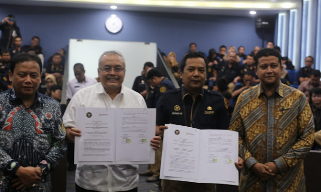 Sekretaris DKPP Bernad Dermawan Sutrisno (ketiga dari kiri) dan Sekretaris Jenderal Bawaslu Gunawan Suswantoro (kedua dari kiri) memperlihatkan perjanjian kerja sama tentang dukungan personil, sarana, dan prasarana pelanggara kode etik penyelenggara pemilu di sela acara peresmian ruang sidang baru DKPP, Rabu 19 Februari 2020/Foto: Humas Bawaslu RI